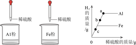 13. 向两个盛有相同质量铝粉和铁粉的烧杯中,分别滴加相同浓度的稀硫酸,产生氢气的质量与加入稀硫酸的质量关系如图所示。下列说法正确的是