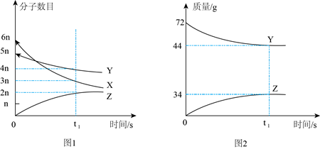 15. 某化学反应在密闭容器中进行,各物质的分子数目,质量随时间变化情况如图1,图2所示。下列说法错误的是