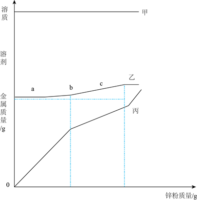 混合溶液的烧杯中,加入锌粉至过量使其充分反应(溶液始终未饱和),烧杯中溶质、溶剂和金属的质量随锌粉质量变化情况如图所示。下列说法正确的是