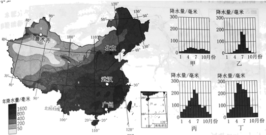 分析降水量分布状况是认识区域差异的重要内容。图为中国年降水量分布和国地降水量柱状图。读图,完成下面小题。
