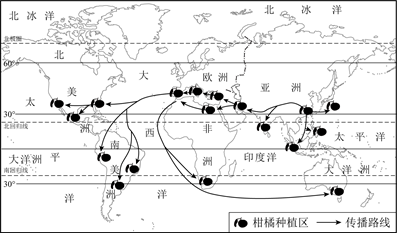 我国是柑橘种植的起源地之一。柑橘通过多种途径向外传播。图为我国柑橘传播路线示意图。读图,完成下面小题。