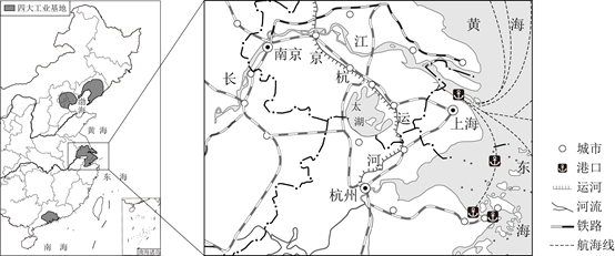 长江三角洲地区对长江流域乃至全国具有辐射带动作用。图为长江三角洲地区简图。读图,完成下面小题。