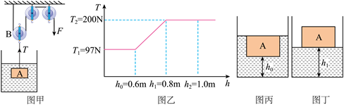 21. 新时代中国科技飞速发展,激发了广大学生学习和研究的热情。某兴趣小组在实验室中模拟深水打捞过程。装置如图甲所示,A为封闭的圆柱金属罐,横截面积S为250cm2,B滑轮重力为50N,横截面积为2S的圆柱槽中装有某种未知密度的液体。现将金属罐A从槽底匀速捞起,在向上捞起过程中,绳索拉力T与金属罐底面到槽底的距离h关系如图乙所示,图丙为金属罐顶面刚到液面的位置,图丁为金属罐底面离开液面的位置(已知 g=10N/kg, 不计绳重和摩擦及液体的阻力,不计物体表面附着液体的影响,捞起过程中金属罐不与槽侧壁接触)。求: