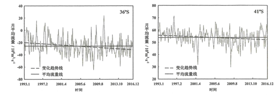 西风漂流绕过南美大陆南端后部分向北形成北上寒流,与巴西暖流交汇后东流。下图为“1993-2016年西南大西洋海区36°S和41°S附近两个截面逐月洋流流量及变化趋势图”(数值表示流量大小;正负表示流向,北向为正,南向为负)。据此完成下面小题。