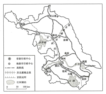 目前,江苏省13个设区市实现了高铁(各类型动车组)市市相通。下图为“江苏省高铁线路分布示意图”。据此完成下面小题。