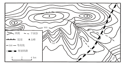 23. 某地规划的铁路穿过一冲积扇。下图为“某地地形及规划铁路位置示意图”。据此回答下列问题。