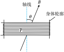 2. 某小组设计了一种呼吸监测方案:在人身上缠绕弹性金属线圈,观察人呼吸时处于匀强磁场中的线圈面积变化产生的电压,了解人的呼吸状况。如图所示,线圈P的匝数为N,磁场的磁感应强度大小为B,方向与线圈轴线的夹角为θ。若某次吸气时,在t时间内每匝线圈面积增加了S,则线圈P在该时间内的平均感应电动势为( )