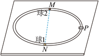 14. 如图所示,桌面上固定有一半径为R的水平光滑圆轨道,M、N为轨道上的两点,且位于同一直径上,P为MN段的中点。在P点处有一加速器(大小可忽略),小球每次经过P点后,其速度大小都增加v0。质量为m的小球1从N处以初速度v0沿轨道逆时针运动,与静止在M处的小球2发生第一次弹性碰撞,碰后瞬间两球速度大小相等。忽略每次碰撞时间。求: