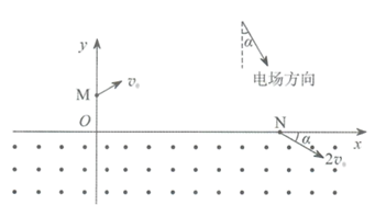 15. 某同学设计了一种粒子加速器的理想模型。如图所示,xOy平面内,x轴下方充满垂直于纸面向外的匀强磁场,x轴上方被某边界分割成两部分,一部分充满匀强电场(电场强度与y轴负方向成α角),另一部分无电场,该边界与y轴交于M点,与x轴交于N点。只有经电场到达N点、与x轴正方向成α角斜向下运动的带电粒子才能进入磁场。从M点向电场内发射一个比荷为