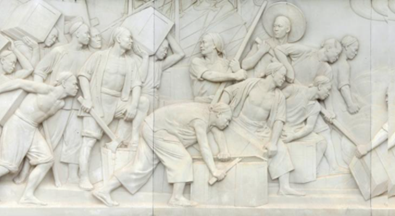 正面:拉普拉普,1521年4月27日,拉普拉普和他的战士们,在这里打退了西班牙入侵者,杀死了他的首领——费尔南多·麦哲伦…… | 反面:费尔南多·麦哲伦,1521年4月27日,死于此地。他是在与马克坦酋长拉普拉普的交战中死亡。麦哲伦船队的一艘船只……于1522年9月6日返抵西班牙,第一次环球航行就这样完成了。 |