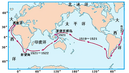 【答案】(1)1519年,麦哲伦船队从西班牙出发,渡过大西洋,绕过南美洲南端进入太平洋。1521年,船队到达菲律宾群岛,在这里麦哲伦被土著人杀死。剩下的船员继续航行,经印度洋,绕过好望角,于1522年回到西班牙,第一次完成了环球航行。