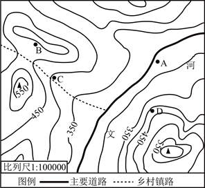【解析】10.读图,图中虚线为乡村道路,鞍部位于两个山峰之间,呈马鞍状;山谷等高线凸向高处,垂直于山谷线作辅助线,辅助线的海拔中间低两侧高;山脊等高线凸向低处,垂直于山脊线作辅助线,辅助线的海拔中间高两侧低;陡崖多条等高线重叠在一起,海拔急剧下降;山峰等高线闭合,中间高、四周低;图中除了鞍部以外,另外的等高线数值向高处凸出为山谷,故C正确;排除ABD,选C。
