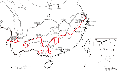 某同学根据《徐霞客游记》手绘了徐霞客从江阴到丽江府的“西行线路图(下图)”据此完成下面小题。