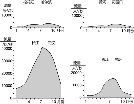 【详解】(1)受夏季风的影响,我国降水集中在夏季,读图可知,四条河流都在夏季形成汛期,冬季由于降水少,形成枯水期;松花江和黄河位于我国北方地区,由于降水少,河流水量少,长江和西江位于我国南方地区,降水多,水量大,形成了南丰北缺的特点。