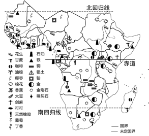 (2)由图和所学知识知,撒哈拉以南非洲主要位于热带,热带经济作物和矿产资源丰富。