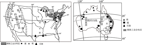 【详解】读图可知,对比美国和澳大利亚的地理位置,不同的是:美国本土位于①北半球、西半球,澳大利亚位于南半球和②东半球;钢铁工业,美国分布在③东北部老工业基地,澳大利亚主要分布在东部地区。相同的是:美国本土濒临大西洋和太平洋,澳大利亚濒临印度洋和太平洋,两国都濒临④太平洋;两国都是地势东西高,⑤中间低;两国都属于发达国家,农业发达,农业的专业化和⑥机械化程度高。