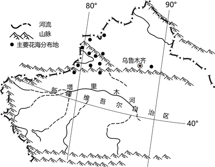 (2)促使“荒山”变“花海”的有利条件:新疆属于温带大陆性气候,夏季气温高,晴天多,日照充足,昼夜温差大;又有来自天山山脉的稳定的灌溉水源,发展花草产业优势明显。