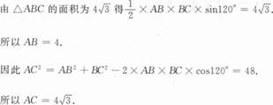 在△ABC中,B=120°,BC=4,△ABC的面积为4根号3,求AC.