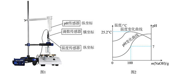 16. 某化学兴趣小组利用数字化实验装置(图1)对中和反应再探究,在烧杯中加入100g未知浓度的稀硫酸,向其中滴加4%的氢氧化钠溶液,实验数据经处理后绘制出图像(图2)。请分析图像完成下列问题。
