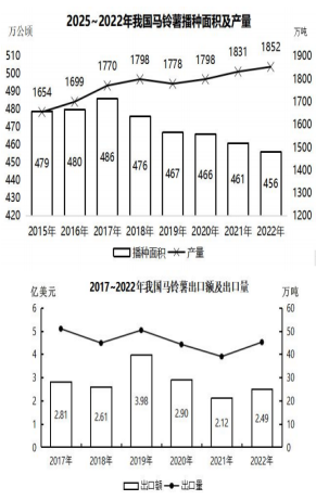 111.2017—2022年我国马铃出口量最高的年份,当年出口额在这6年中排名)