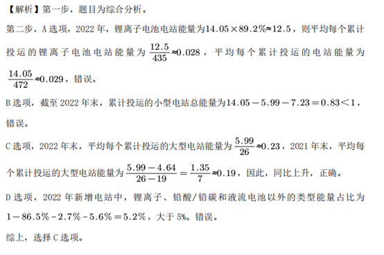 第三步,由材料可知,2022年新增投运的电化学储能电站中,平均每个大型电站的能量为1921t,平均每个中型电站的能量为,则平均每个大型电站的能量约是中型电站的o4192:17 -19×2.92~6×1.6-9.6,和选项A最接近。