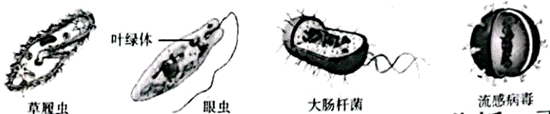 【分析】图中草履虫、眼虫、大肠杆菌都是单细胞生物,病毒没有细胞结构。