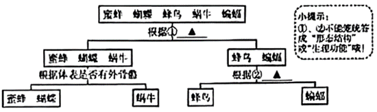 ①蜜蜂、蜗牛等动物的体内没有脊椎骨构成的脊柱,属于无椎动物,蜂鸟和蝙蝠的体内有脊椎骨构成脊柱,属于脊椎动物,所以分类的依据是体内有无脊柱;也可以个依据体温是否恒定分类,蜜蜂和蜗牛的体温不恒定,随环境温度的变化而变化,蜂鸟、蝙蝠的体温不随环境温度的变化而变化,属于恒温动物。②蜂鸟的体表被履羽毛,具有保温作用,还有利于飞行,蝙蝠属于哺乳动物,体表被毛,具有保温作用。蜂鸟有喙无齿,而蝙蝠有牙齿的分化。蜂鸟的生殖方式是卵生,蝙蝠的生殖方式是胎生和哺乳,大大提高后代的成活率。综上分析可知,蜂鸟与蝙蝠的分类依据是体表被毛或体表覆羽(或“体表是否被毛”、“体表是否覆羽”);是否有牙齿;卵生或胎生(或“是否卵生”、“是否胎生”);是否哺乳。