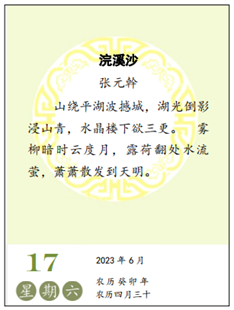 14. 为提升亚运热度,同时向国内外友人展示“在湖州看见美丽中国”,湖州市正制作“湖州宋韵文化日历”。日历上选用了这首词(如下图),给出的理由是“景生情,情衬景,相得益彰”。请结合相关内容分析。