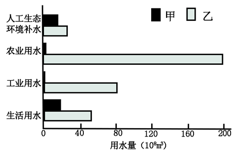 一个区域的水资源总量与该区域的降水量和面积成正相关。下表为2022年我国甲、乙两省(区市)水资源状况,下图为甲、乙用水量的构成。完成下面小题。