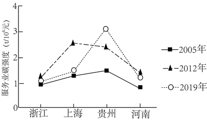 服务业碳强度即服务业单位国内生产总值的二氧化碳排放量,它是衡量区域服务业减排绩效的重要指标。下图为四省市服务业碳强度变化图。完成下面小题。