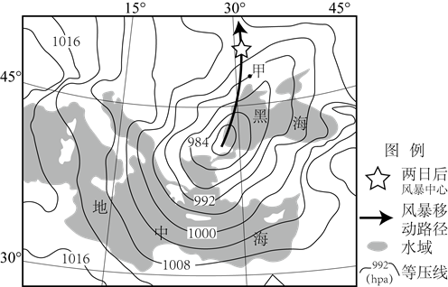 2023年某日,一场源自地中海的风暴席卷黑海北岸,给甲地带来强降水。下图为该日某时刻的天气形势图。完成下面小题。