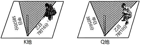 A. 甲日日落地方时,K地比Q地大 B. 甲日晨线与经线夹角,K地比Q地大