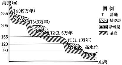 河流阶地是发育在河谷两侧高水位之上的阶梯状台地。下图为某河流阶地剖面示意图,图中标注的时间为阶地形成的距今时间。完成下面小题。