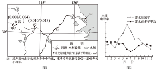 材料一图1为长江两水文站位置及水文数据图,悬沙是指河水中悬移的泥沙,甲地为雨养农业(无人工灌溉,仅靠自然降水作为水分来源的农业生产)区。图2为图1中甲地某年土壤盐分变化图,土壤电导率值越大盐分越高。