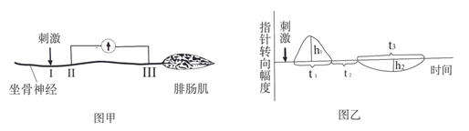 18. 坐骨神经可以支配包括腓肠肌在内的多块骨骼肌。取坐骨神经腓肠肌标本,将电位表的两个电极置于坐骨神经表面II、III两处,如图甲。在坐骨神经I处,给一个适当强度的电刺激,指针偏转情况如图乙,其中h1>h2,t1<t3。下列叙述错误的是( )