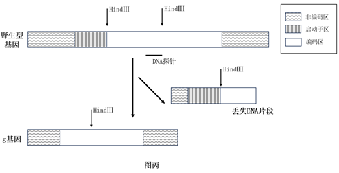 (2)从野生型、f杂合子和f小鼠组织中分别提取DNA,用限制酶HindⅢ酶切,进行琼脂糖电泳,用DNA探针检测。探针的结合位置如图甲,检测结果如图乙,则f小鼠和f杂合子对应的DNA 片段分别位于第______泳道和第______泳道。