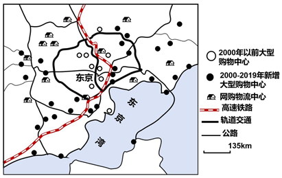 (1)指出2000年前后东京都市圈大型购物中心分布的变化特点。