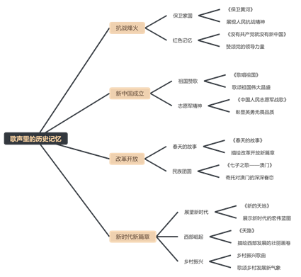 (2)思维导图:根据材料并结合所学知识,制作一幅思维导图即可,包括思维导图名称(歌声里的历史记忆)、主干(四个主题:抗战烽火、新中国成立、改革开放、新时代篇章)、分支等,注意要求:任意选取表中的部分歌曲,至少提炼出四个主题;在每个主题后至少列出一首对应的歌曲名称;以思维导图的方式呈现出来。结构清晰,符合逻辑。