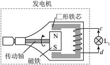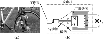 某自行车所装车灯发电机如图(a)所示,其结构见图(b)。绕有线圈的匚形铁芯开口处装有磁铁。车轮转动时带动与其接触的摩擦轮转动。摩擦轮又通过传动轴带动磁铁一起转动,从而使铁芯中磁通量发生变化。线圈两端c、d作为发电机输出端。通过导线与标有“12V,6W”的灯泡