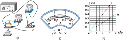 (2)多次改变导体A两端的电压,并记录对应的________。换用导体B重复上述实验,根据实验数据绘制图像如图丙所示。分析图像发现,同一导体两端的电压与通过电流的比值是________的,因此将这个比值定义为导体的电阻;