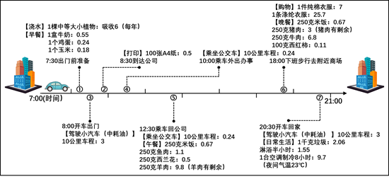 材料二 如何实现生活质量提升与碳排放量增长的脱钩?对于社会大众而言,我们可以选择绿色低碳生活。让生活更低碳,可以怎么做?以下主要是某中学生家长一天工作、生活中二氧化碳排放的部分情况,请你沿着他的轨迹来探寻。
