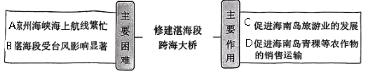 (5)湛海段跨海大桥建设可行性评估是人们关注的重点。在下列选项中选出建设湛海段跨海大桥的主要困难__________和主要作用__________。