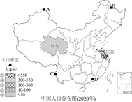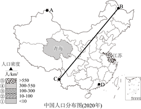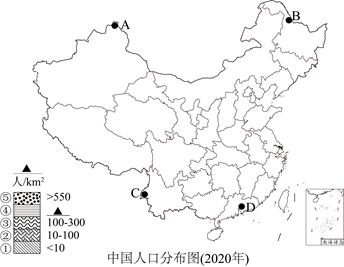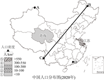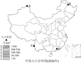 (4)完成“中国人口分布图”后,接着可以确定我国人口地理界线。在上图“A、B、C、D”四点中选择合适的两点,画出人口地理界线,并说明我国人口分布特点是____。