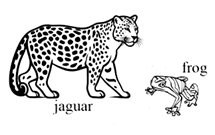 More than 1,300 species of birds and over 400 species of mammals (哺乳动物) hide among the forest’s plant life. This jaguar is one example. While a large number of jaguars survive here, they are only one part of this forest's food chain (食物链). They feed on at least 87 species, including frogs. These frogs, in turn, feed on insects which eat leaves and fruit.