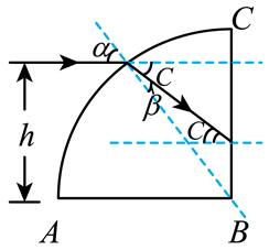 ,其横截面为四分之一圆,圆的半径为R,如图所示。截面所在平面内,一束与AB边平行的光线从圆弧入射。入射光线与AB边的距离由小变大,距离为h时,光线进入柱体后射到BC边恰好发生全反射。求此时h与R的比值。