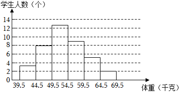 【分析】由体重统计直方图,可知体重在39.5~44.5千克的人数为3人,体重在44.5~49.5千克的人数为8人,体重在49.5~54.5千克的人数为13人,体重在54.5~59.5千克的人数为9人,体重在59.5~64.5千克的人数为5人,体重在64.5~69.5千克的人数为2人。