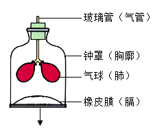 【分析】图示模拟了膈肌的收缩和舒张与呼吸运动的关系,膈肌舒张,膈顶上升,肺内气体排出,是呼气过程;膈肌收缩,膈顶下降,外界气体进入肺内,是吸气过程。