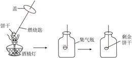 【详解】燃烧饼干:根据实验现象:①饼干在空气中燃烧起来;②在装有氧气的集气瓶中燃烧得更剧烈,片刻后火焰逐渐变小直至熄灭;此时集气瓶中有雾气,燃烧匙中仍有饼干剩余,可知:饼干能在氧气中燃烧;氧气的含量越高燃烧越剧烈;