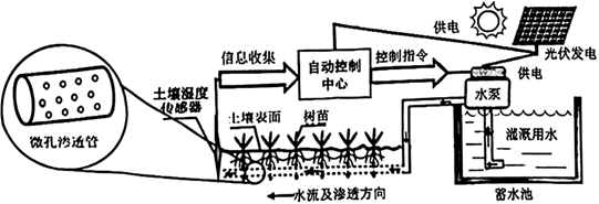 读图可知,该系统所需电能由太阳能转化而来,太阳能取之不尽用之不竭,属于可再生能源,清洁无污染。该系统可实现自动精准灌溉。图中“土壤湿度传感器”负责收集土壤湿度信息,相当于人的感觉器官;“自动控制中心”负责分析数据并对水泵发出指令,相当于人的大脑,精准指挥水泵抽水,进行灌溉。该系统中水通过微孔渗透管上的小孔,对树苗根部附近土壤进行滴灌,调节土壤湿度。相比直接将水浇灌在土壤表面,可更有效地减缓土壤中的水分蒸发,减少水资源的使用,达到节水的目的。
