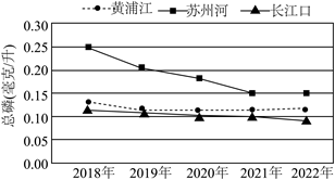 (2)根据图示信息可知,苏州河的总磷含量变化比较明显,故近年来上海市水质改善最明显的水体是苏州河,长江口的总磷含量最低,则上海市饮用水水源最佳取水地是长江口;自来水生产过程中,消毒杀菌环节可加入的试剂是氯气、二氧化氯等;